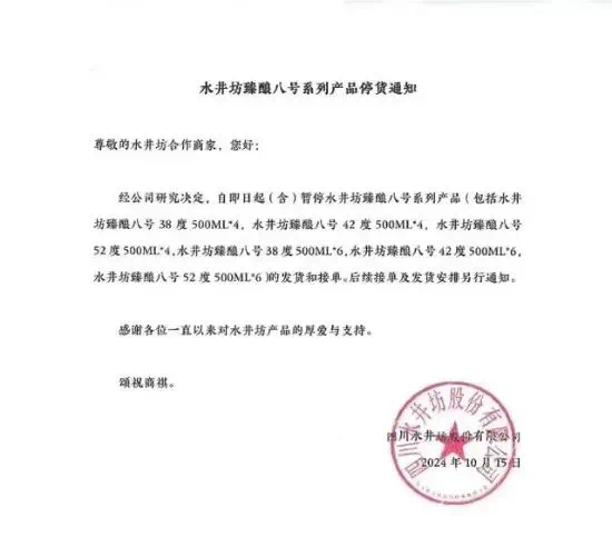 这一放缓趋势反映了水井坊次高端酒品经营面临的挑战。2024年10月中旬,水井坊发布了《水井坊臻酿八号系列产品停货通知》,决定暂停臻酿八号系列产品的发货和接单,此举被视为优化渠道供需关系、控货挺价,以应对行业下行周期和大单品价格倒挂的策略。